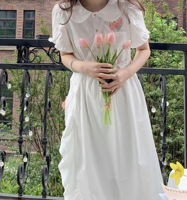 法式复古白色印花减龄娃娃领连衣裙仙女超仙森系夏泡泡袖气质长裙