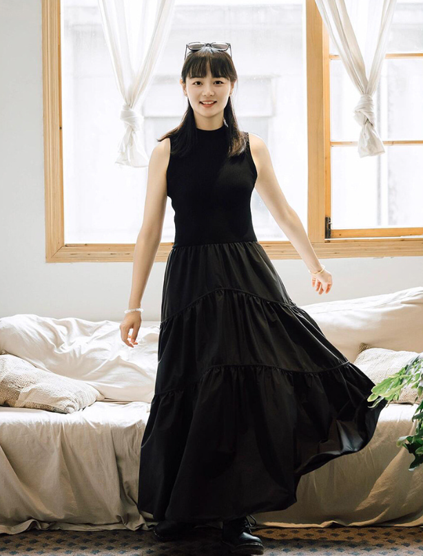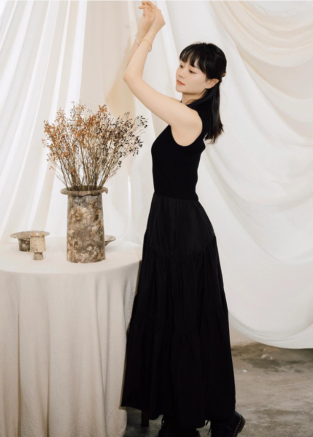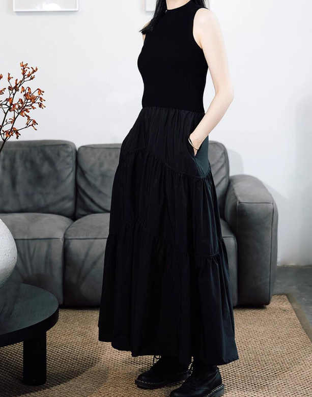 小高领针织连衣裙蛋糕裙拼接高腰无袖2025秋季新品女百褶气质黑色