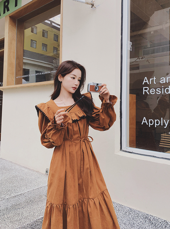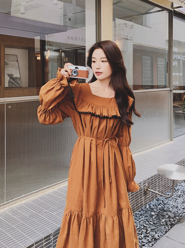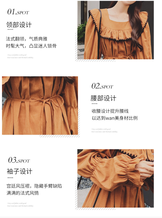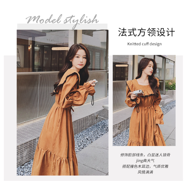 2023法式方领木耳边长袖连衣裙女春款别致独特收腰显瘦中长裙